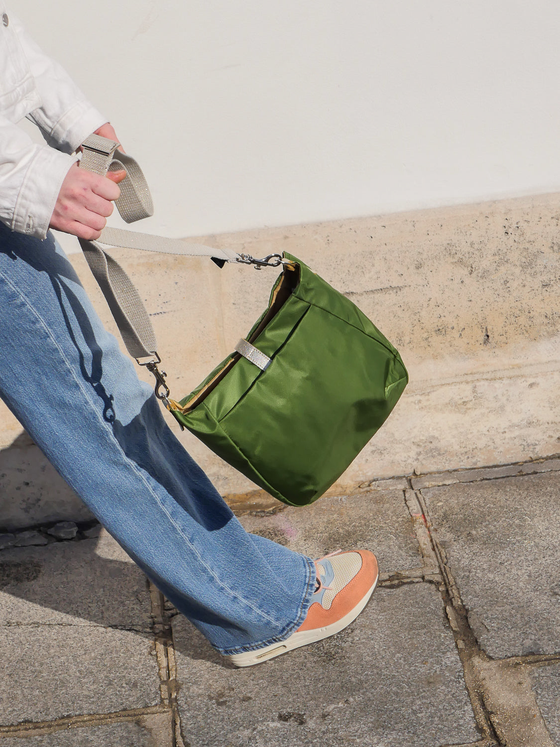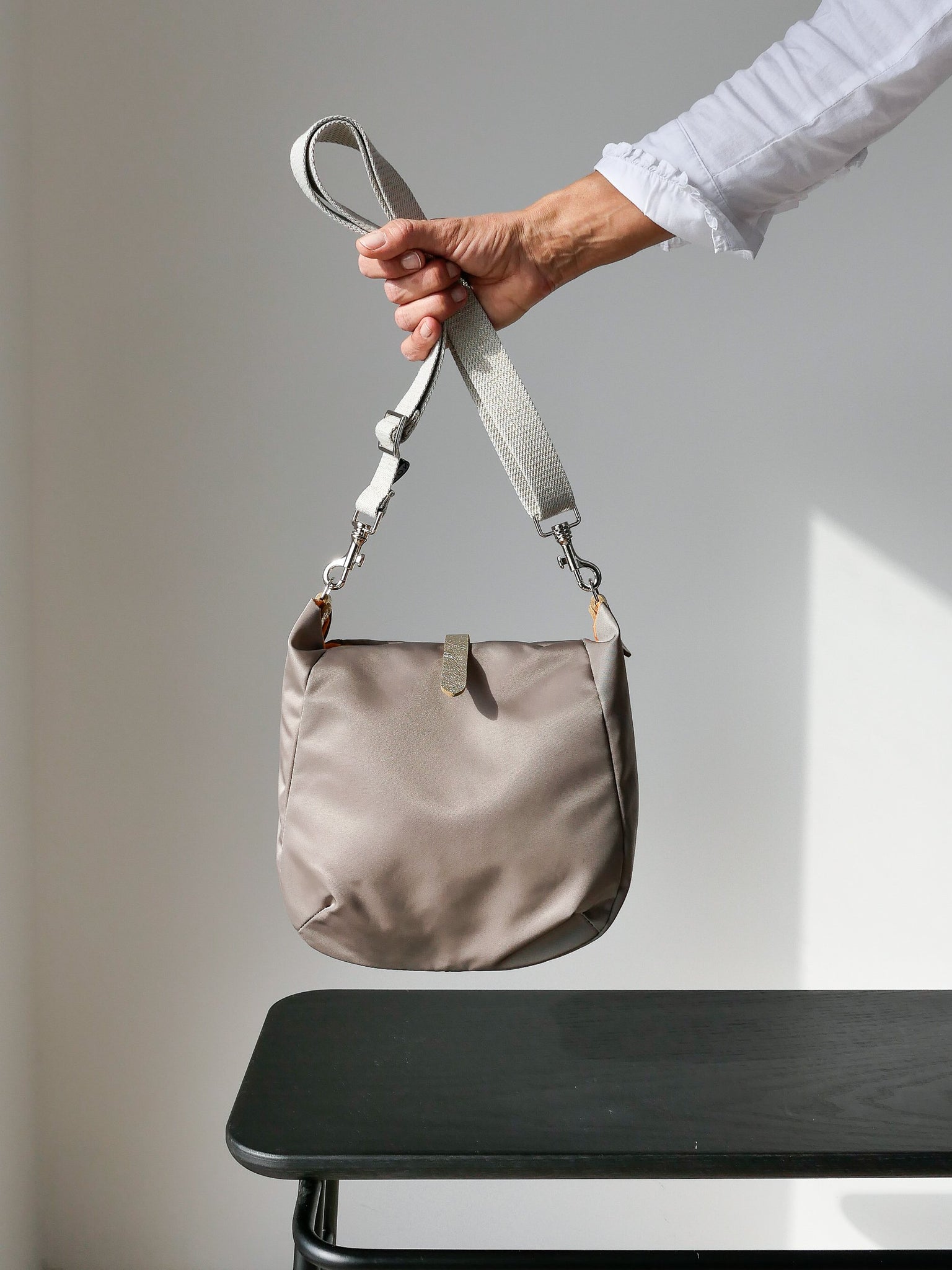 Hattie, sac en nylon satiné bicolore rehaussé d’un empiècement en cuir pleine fleur doré.