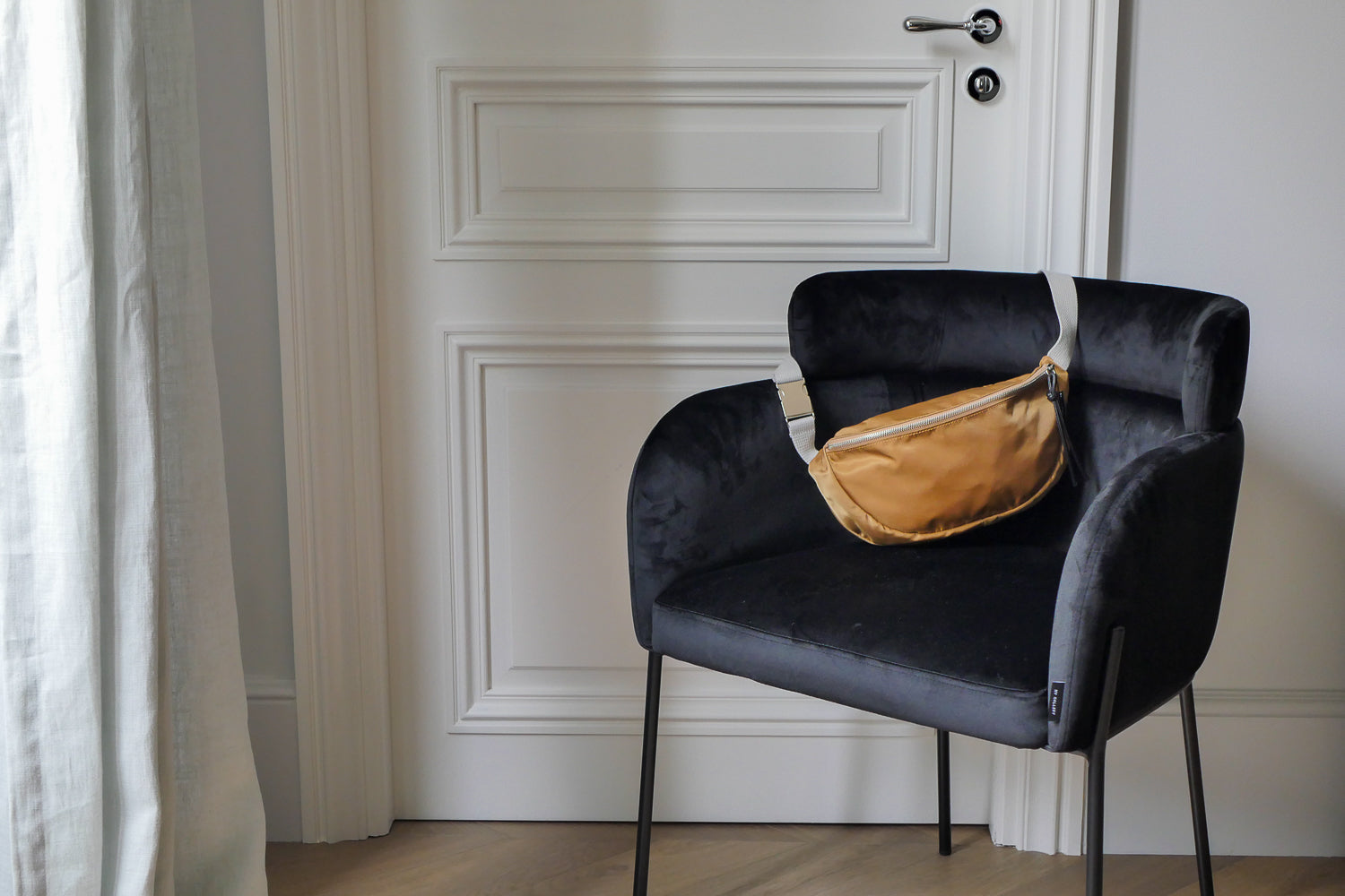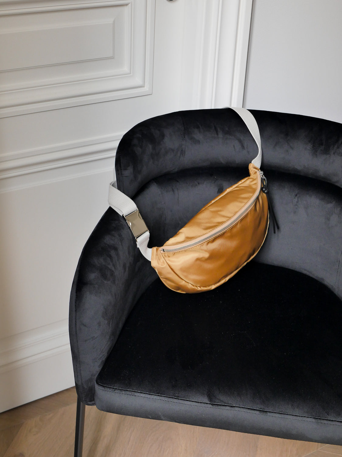 Sakari, le sac banane en nylon satiné, fermé par une glissière métallique avec tirette en cuir. À l’intérieur, une poche pour garder l’essentiel sous la main. Sa large bandoulière tressée en coton lavé (3 cm) le rend super confortable au quotidien.