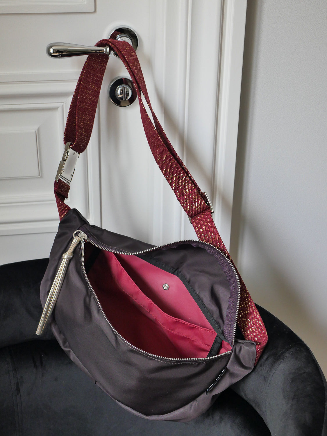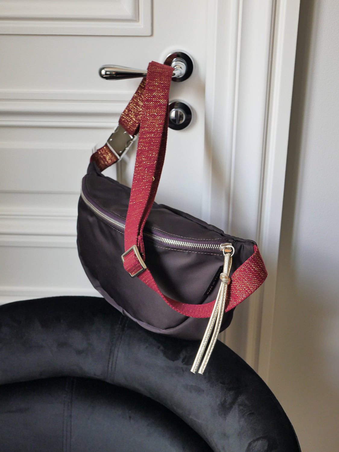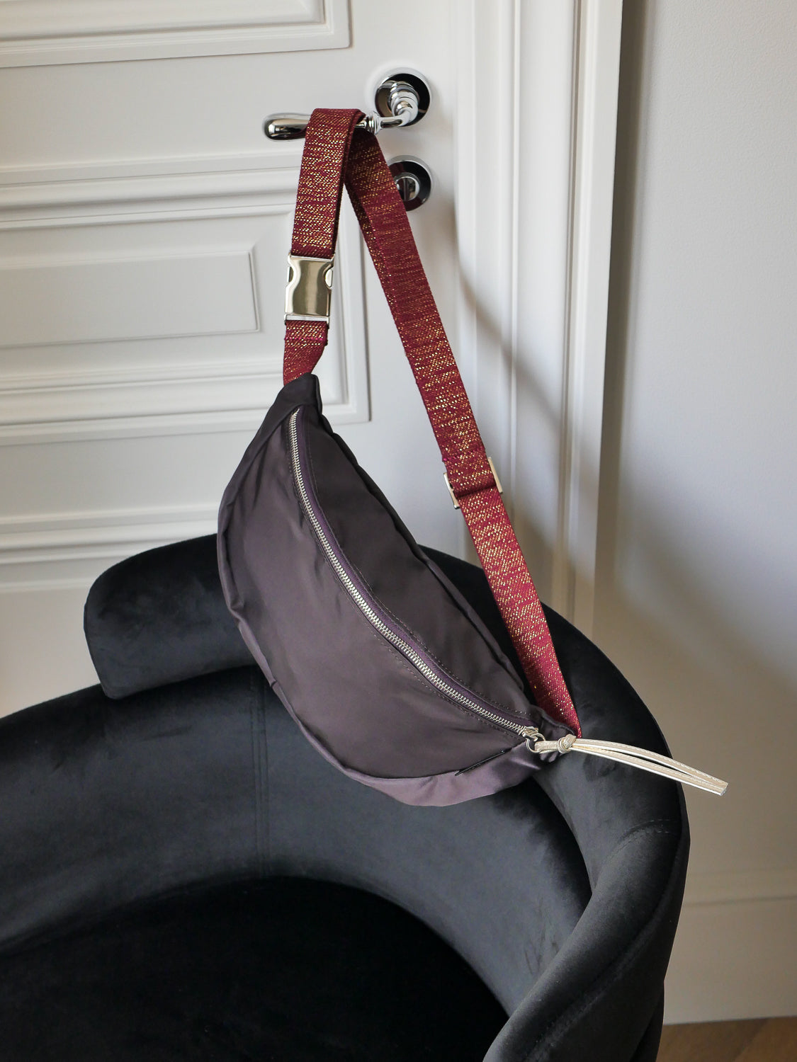 Sakari, le sac banane en nylon satiné, fermé par une glissière métallique avec tirette en cuir. À l’intérieur, une poche pour garder l’essentiel sous la main. Sa large bandoulière tressée en coton lavé (3 cm) le rend super confortable au quotidien.