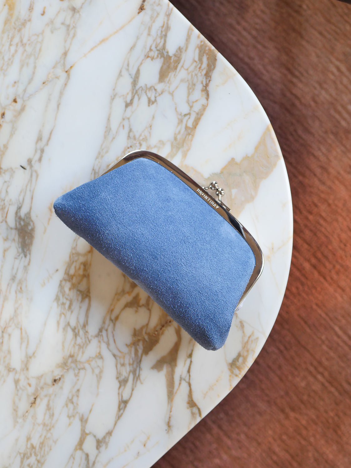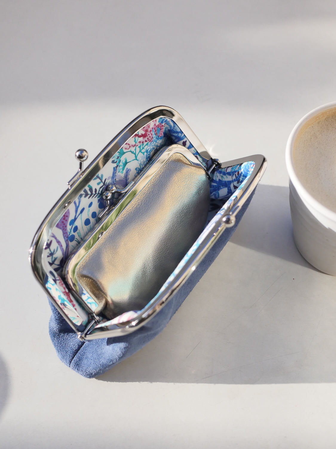 Son extérieur en daim ultra-doux s’ouvre sur un intérieur en cuir de veau pleine fleur doré, révélant la surprise d’un second compartiment doublé d’un tissu Liberty of London. Un ravissement pour les yeux comme pour les mains.