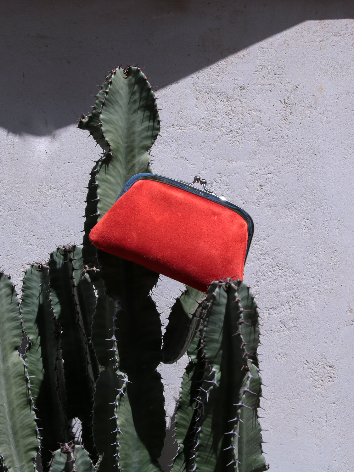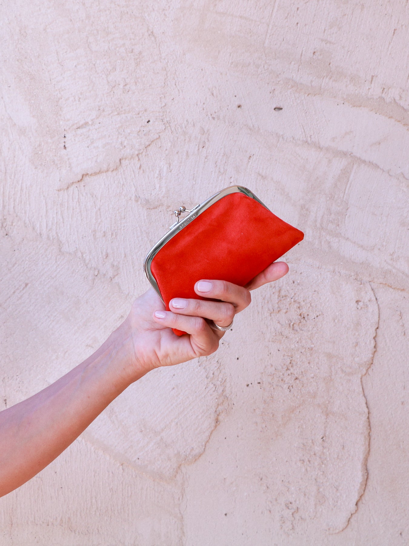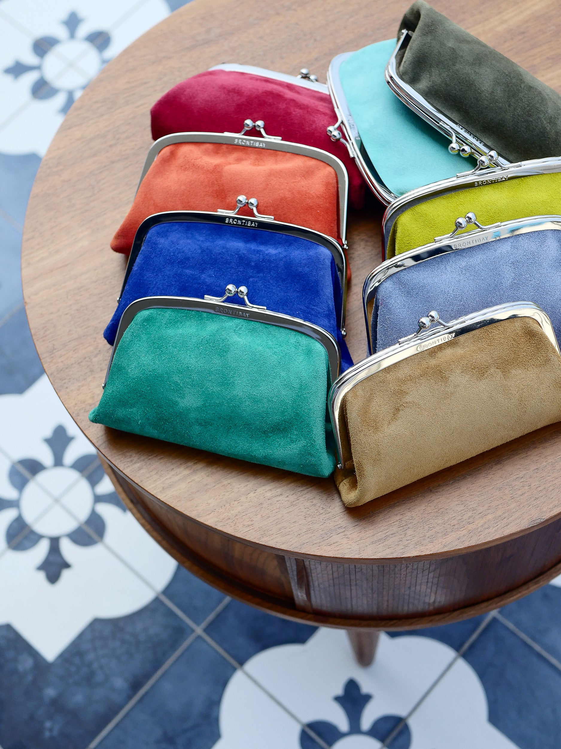 Son extérieur en daim ultra-doux s’ouvre sur un intérieur en cuir de veau pleine fleur doré, révélant la surprise d’un second compartiment doublé d’un tissu Liberty of London. Un ravissement pour les yeux comme pour les mains.