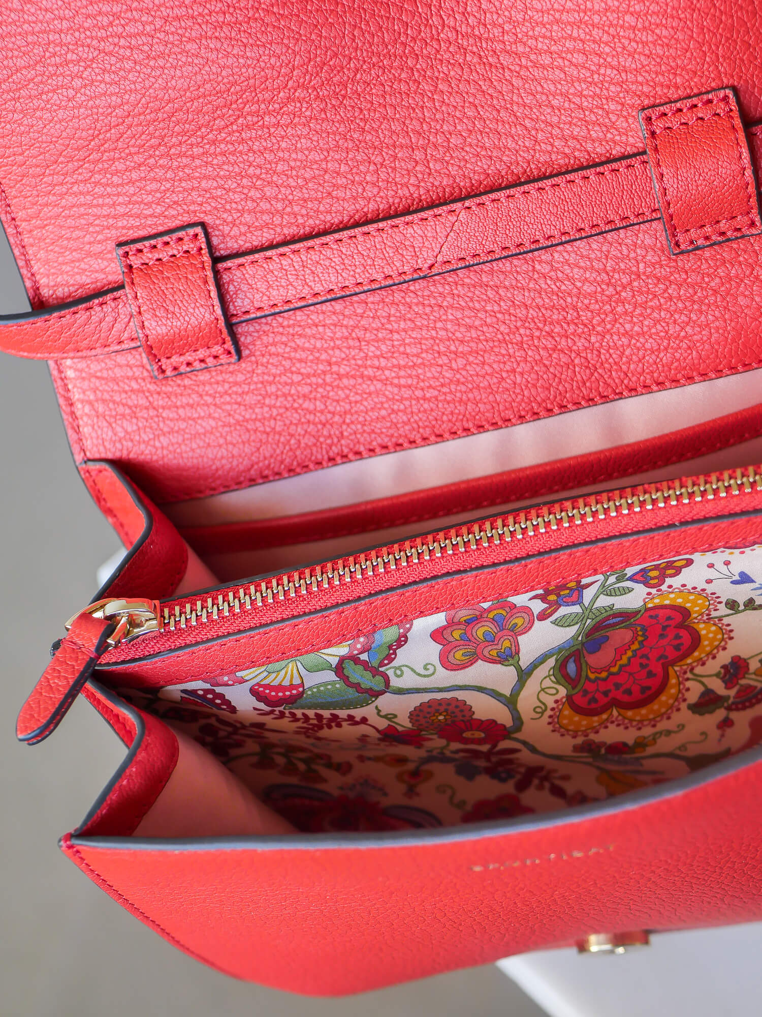 À porter croisé ou à l’épaule, il est doublé d’un imprimé Liberty, doté d’une poche centrale zippée, d’une bandoulière réglable, et se ferme par un top magnétique doré.