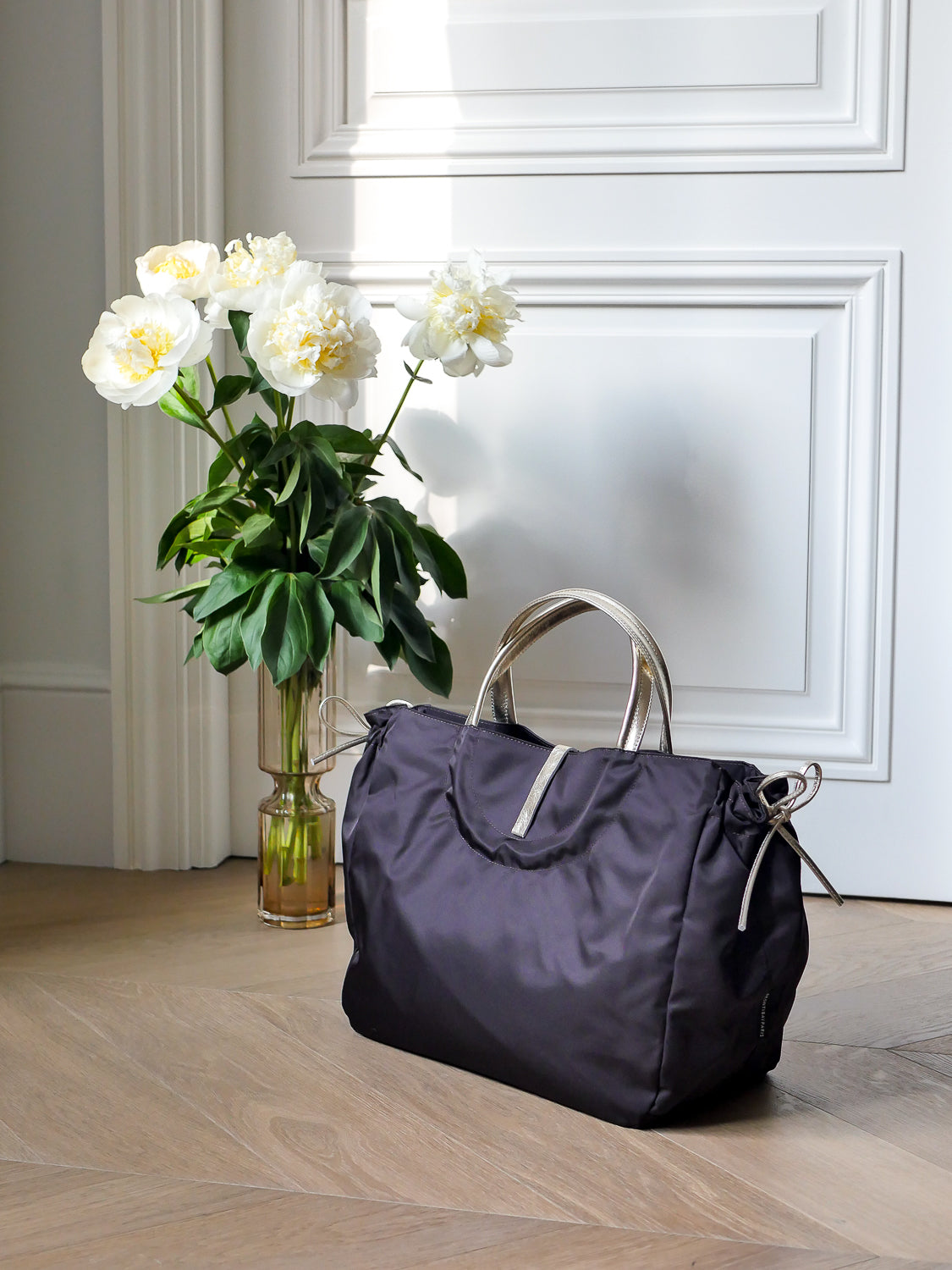 The Venise tote is a signature design inspired by the effortless elegance of the 1960s film La Dolce Vita. Crafted from satin-finish nylon with rounded full-grain leather handles, it is both lightweight and stylish.