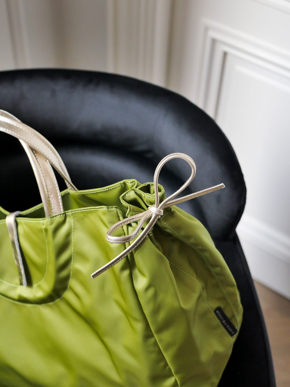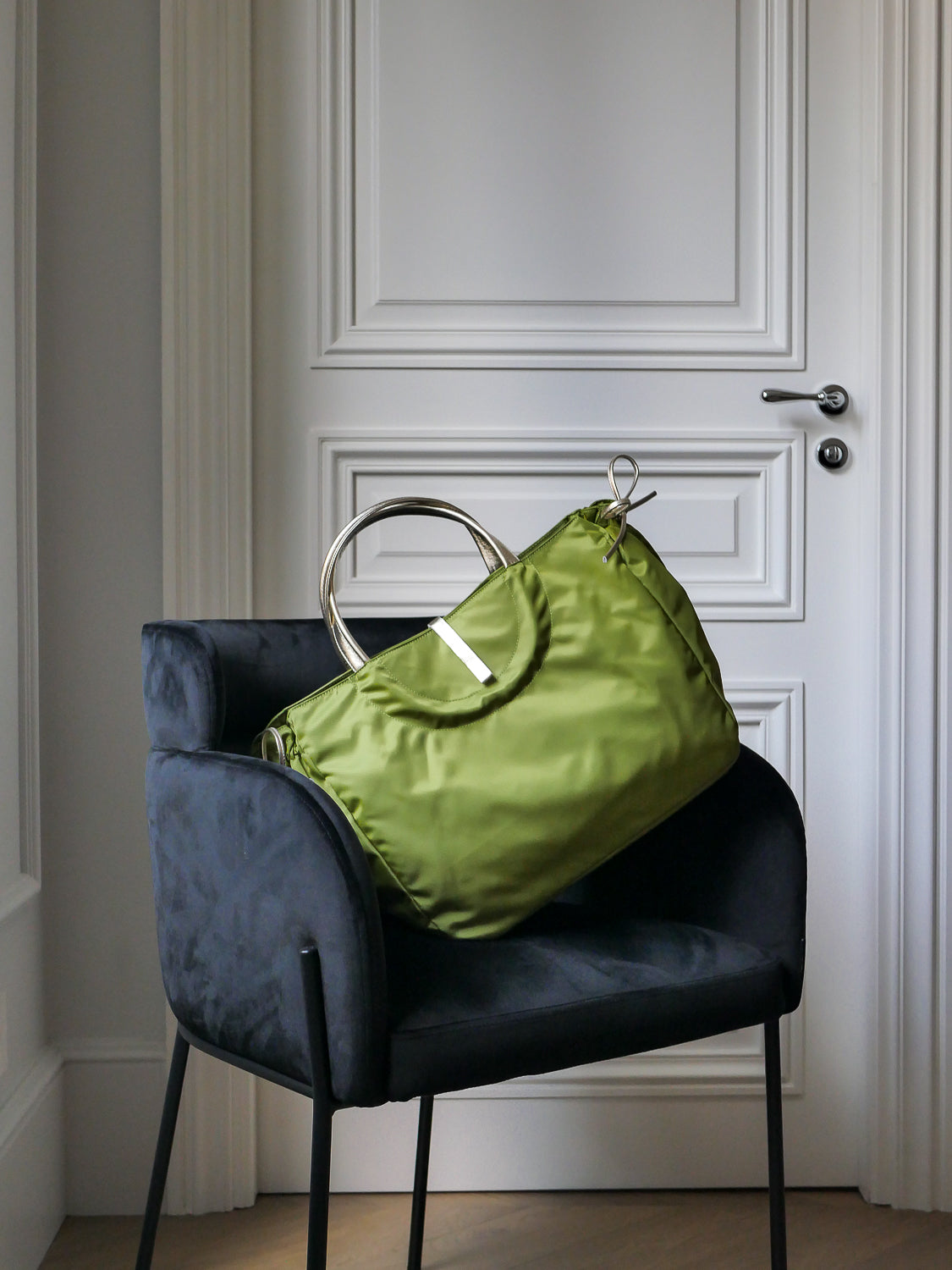 The Venise tote is a signature design inspired by the effortless elegance of the 1960s film La Dolce Vita. Crafted from satin-finish nylon with rounded full-grain leather handles, it is both lightweight and stylish.