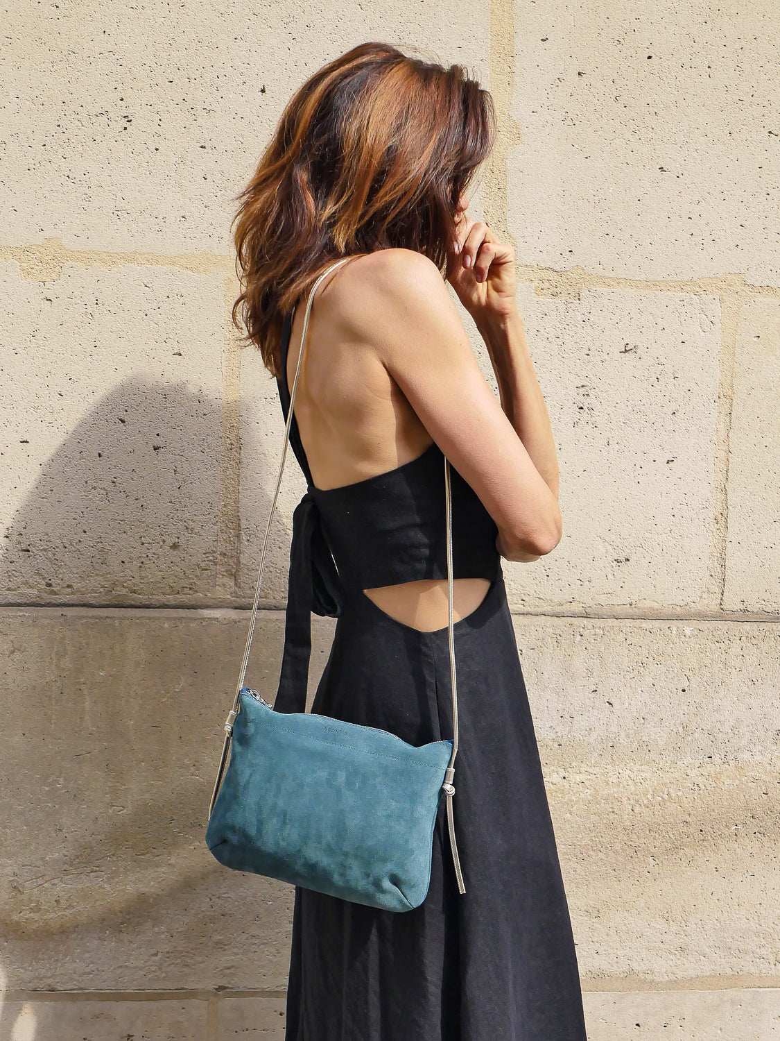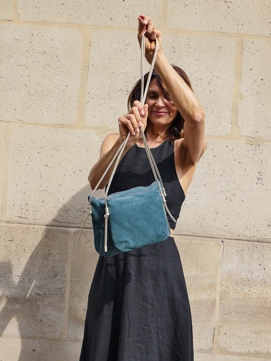 Brera, the suede crossbody bag with an adjustable strap in full-grain metallic leather. The ideal size for your essentials: phone, keys, wallet, glasses, and lip gloss fit comfortably. The suede is of Italian origin, without any protection, allowing for a natural feel, a supple finish, and an authentic look.
