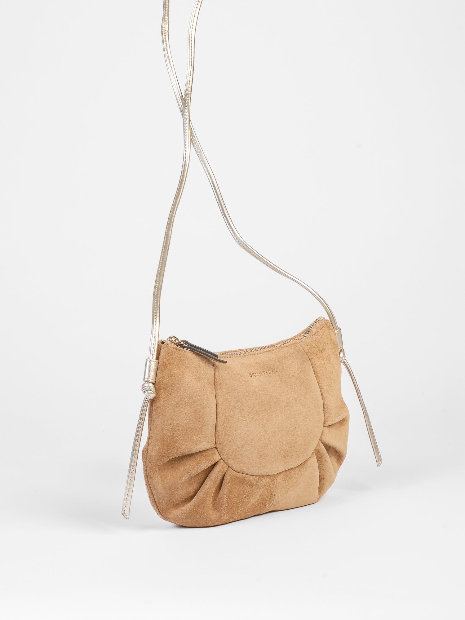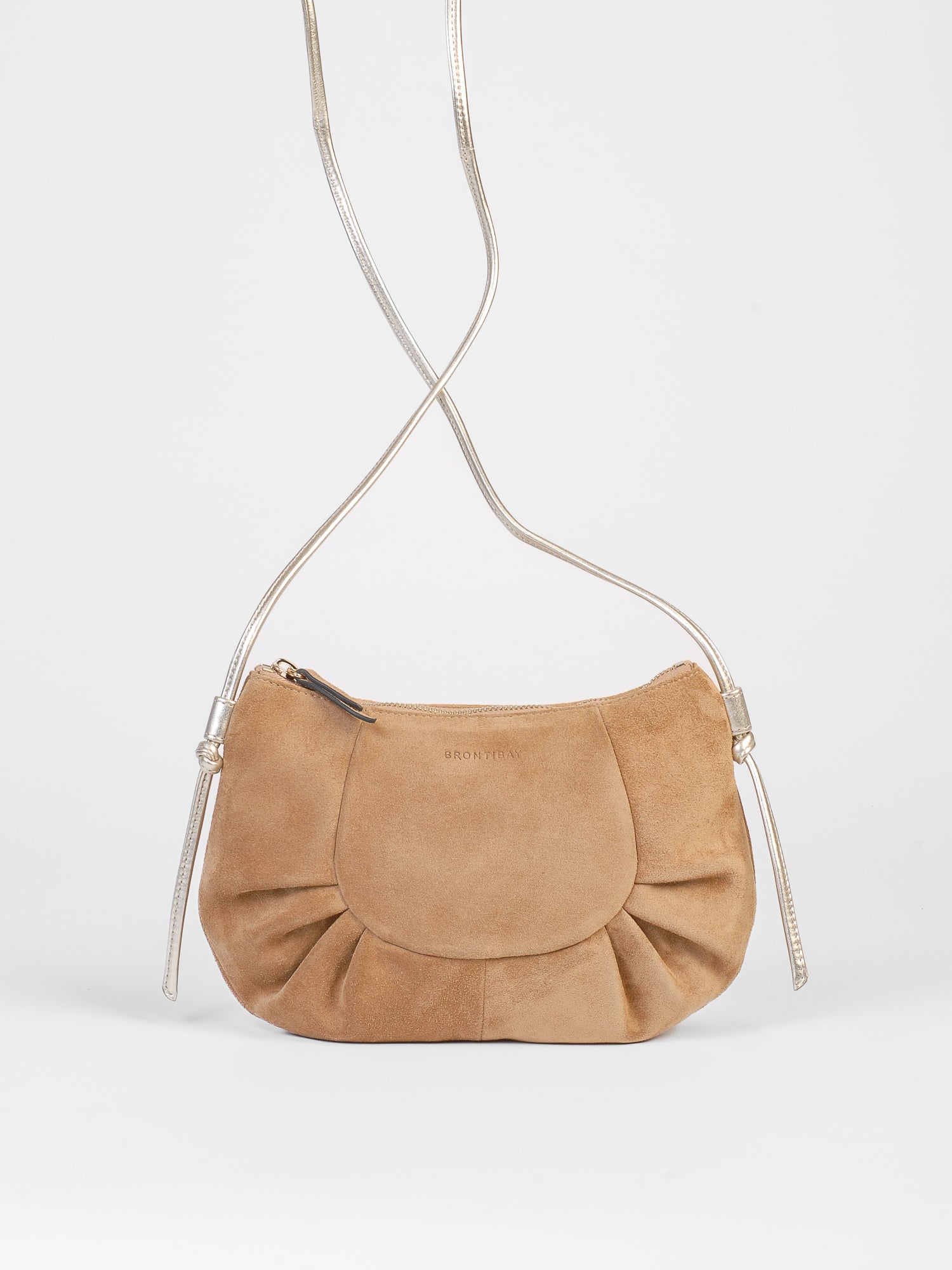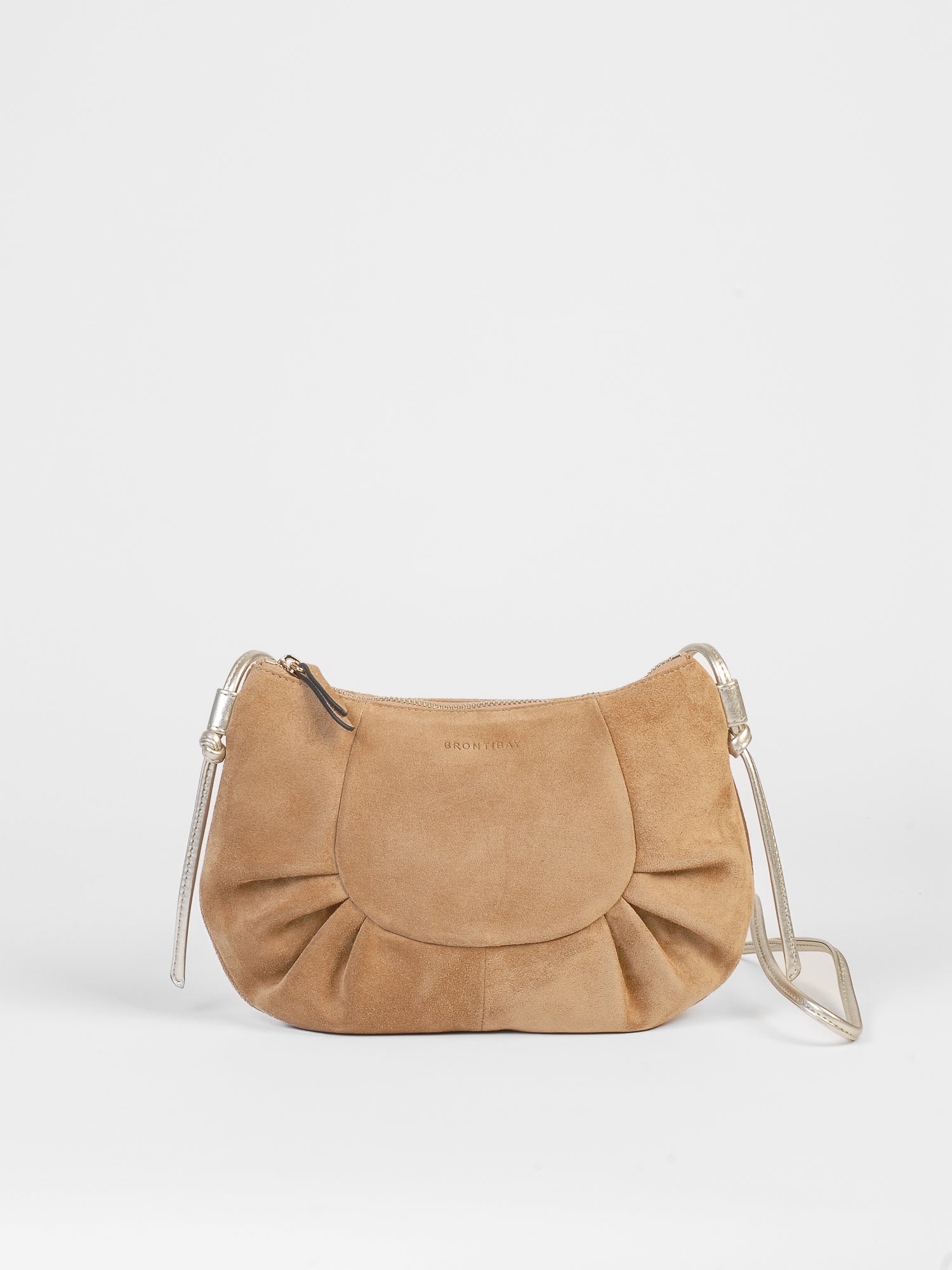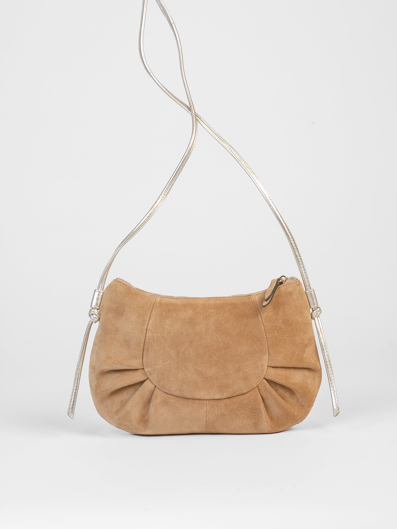 Inès in ultra-soft suede calfskin with a gold metallic leather shoulder strap. Interior designed for the essentials—phone, keys, lipstick, wallet. A sculptural cut, just what you need. Wear it across your body, anywhere, anytime.