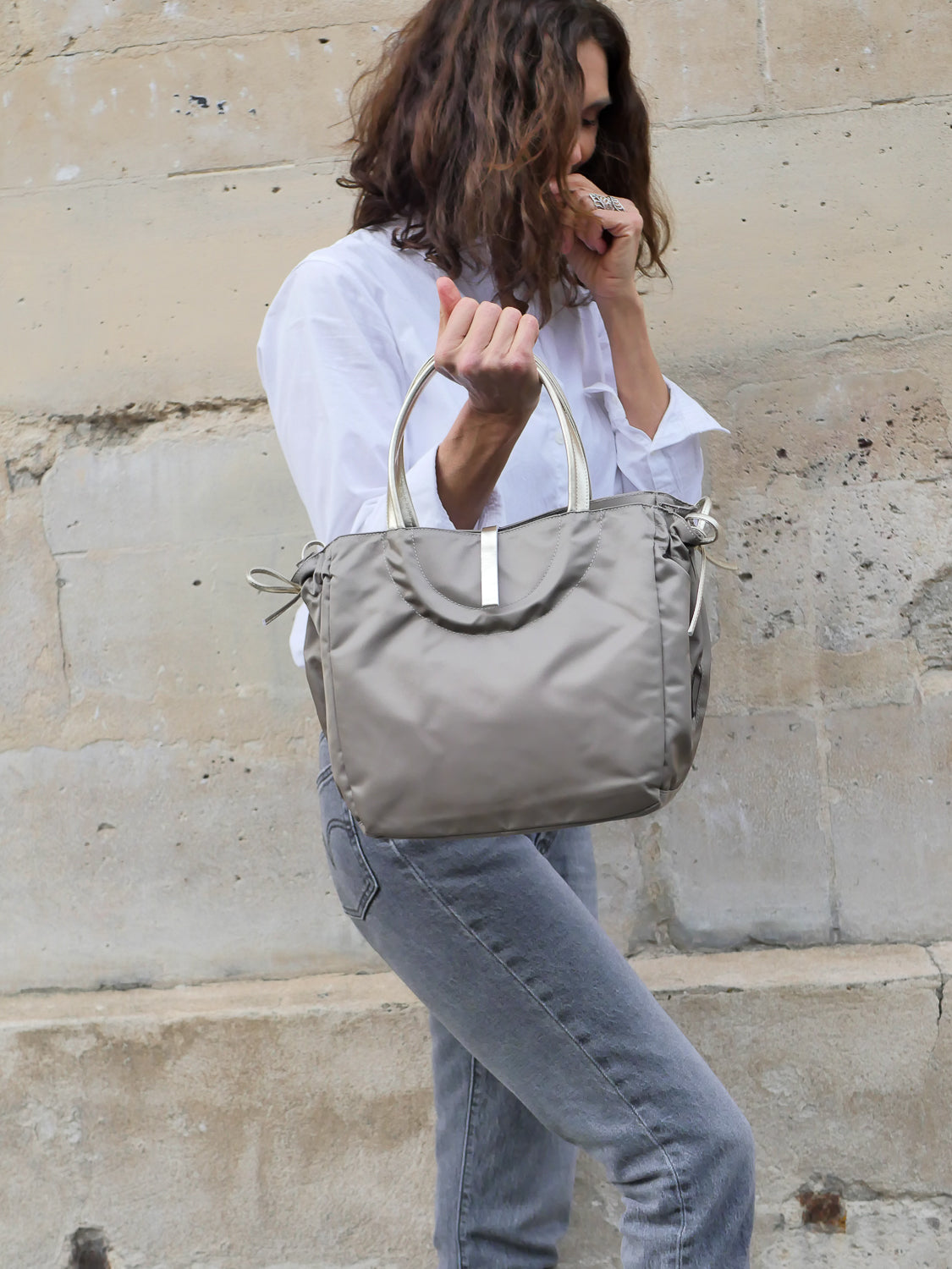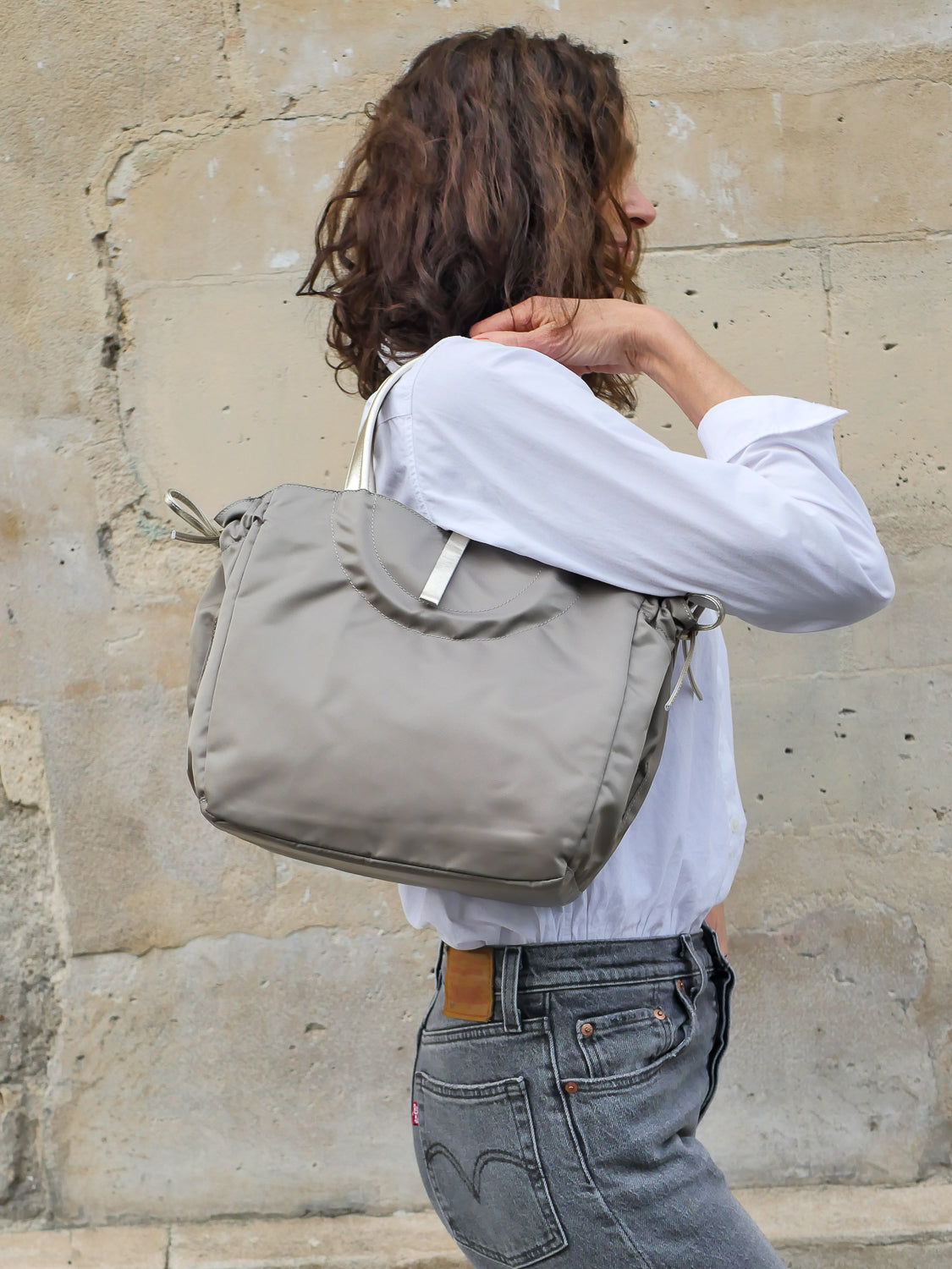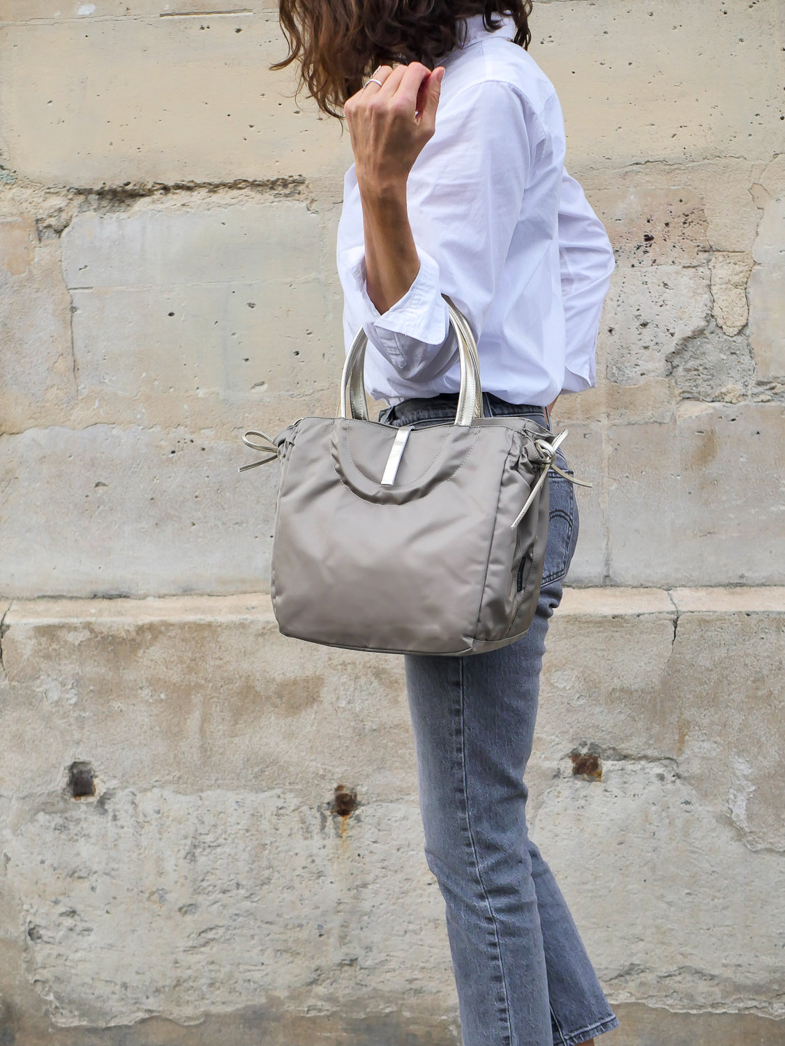 The Naples tote draws inspiration from the timeless elegance of the 1960s film La Dolce Vita. Made from soft, satin-finish nylon, it is accented with rounded full-grain leather handles for a refined, sophisticated touch.