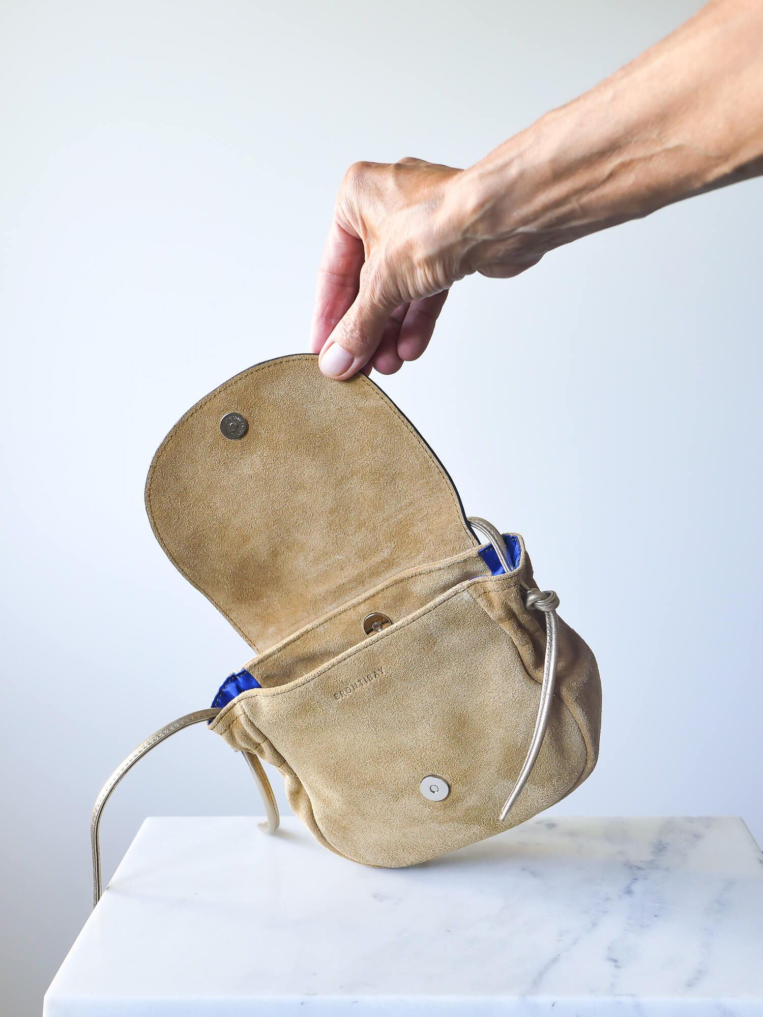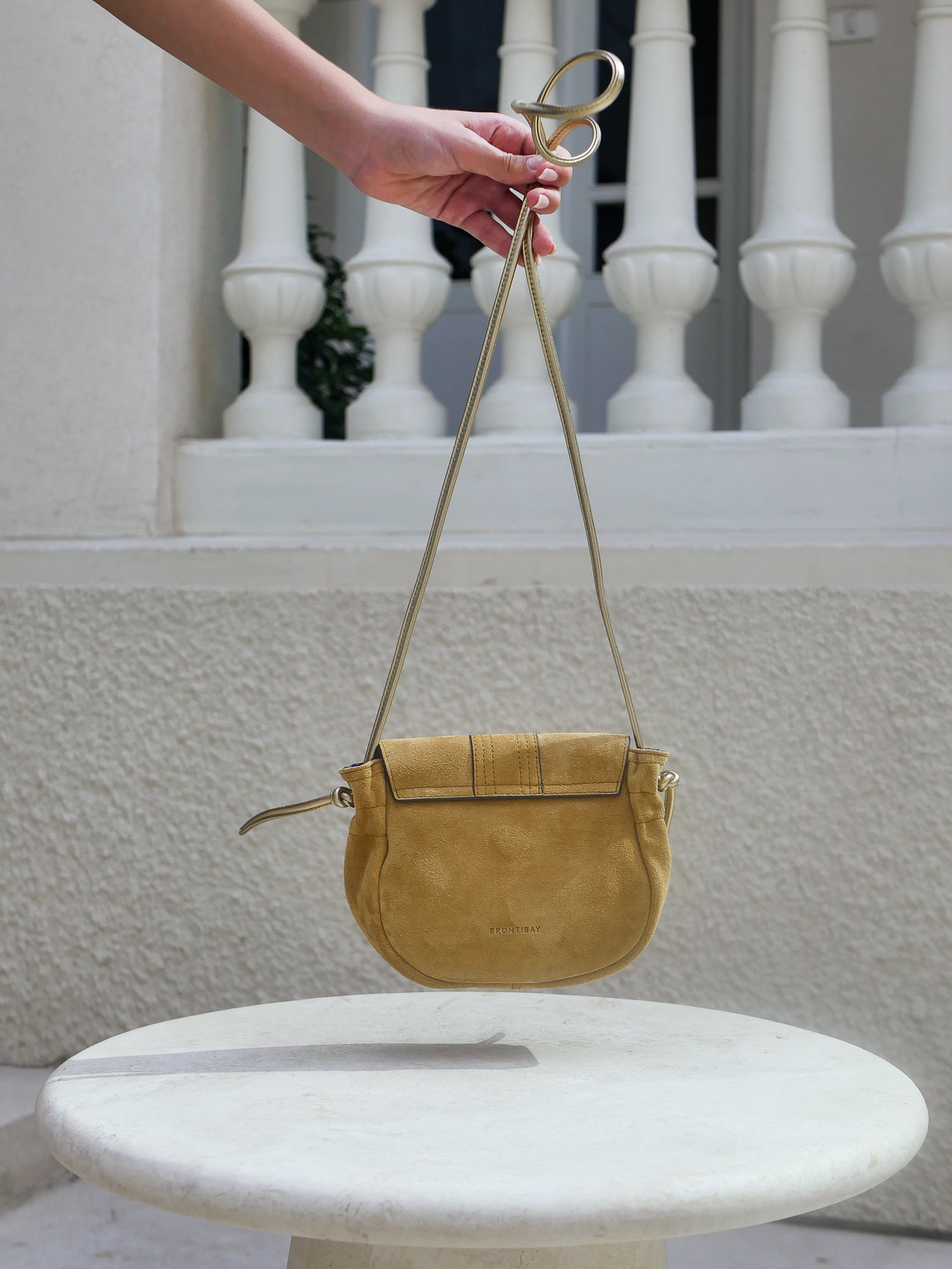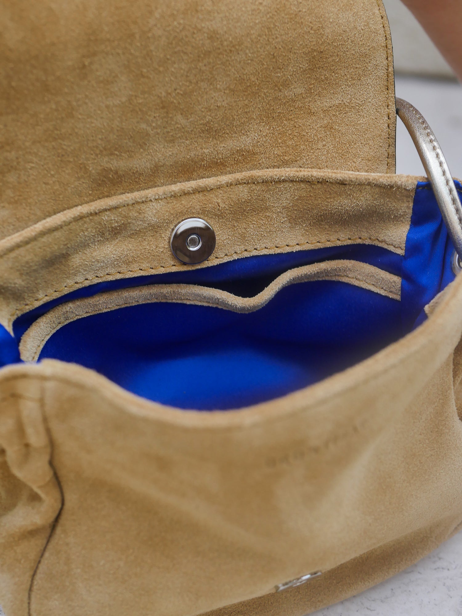 Chrissy, mini-sac à rabat en daim avec ces deux anses: une en cuir doré et une en cuir assorti à la couleur de daim. Riche et soyeux, un kaléidoscope de couleurs intenses. Inspiré des années 70, notre Chrissy réinventant le passé et réhabilitant le style classique vintage. Porté croisé ou épaule, doublé satin avec une poche intérieure, bandoulière réglable et fermer avec un top magnétique.