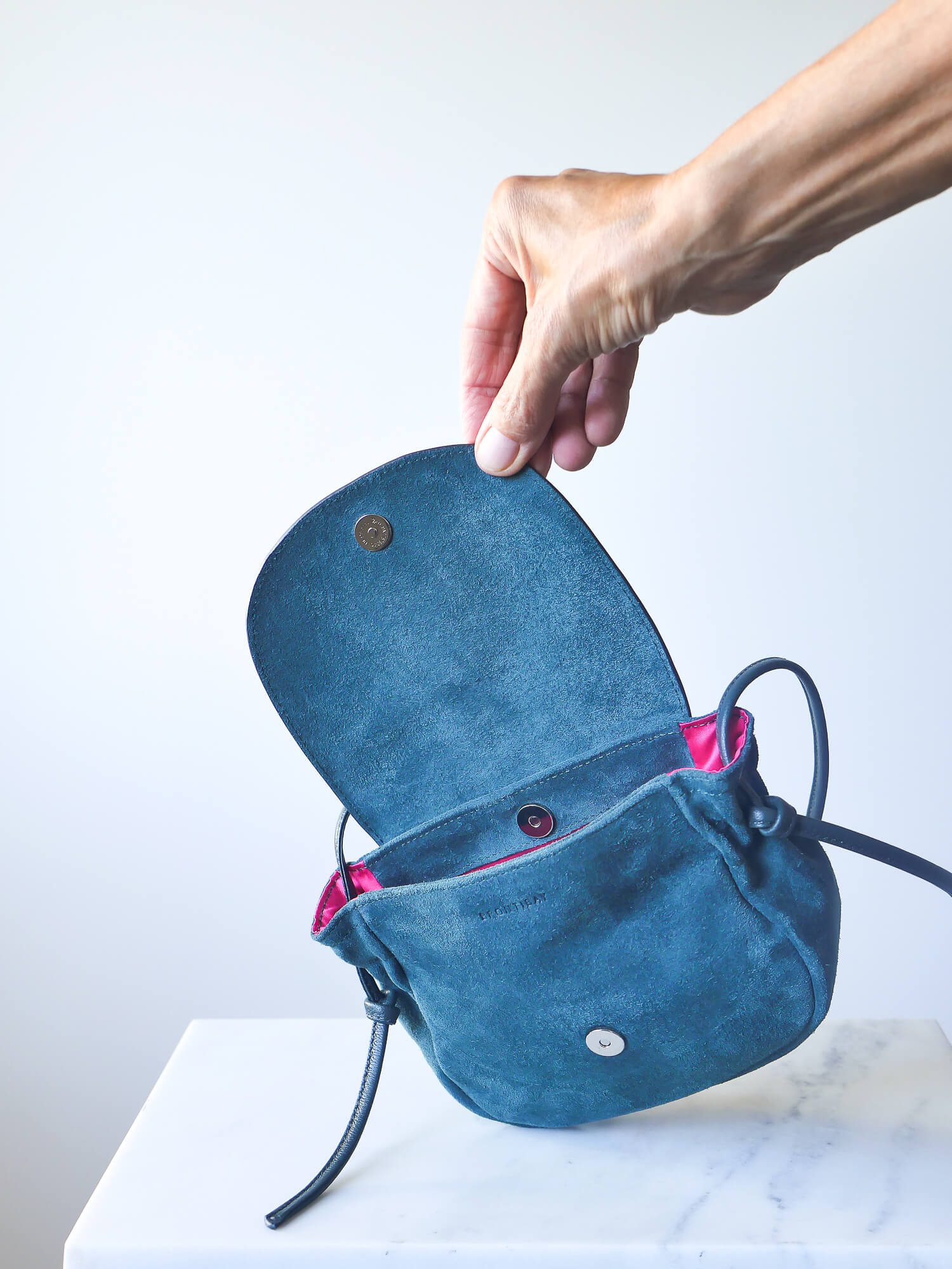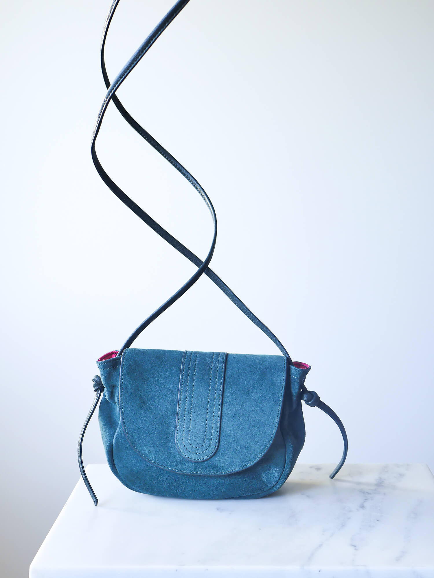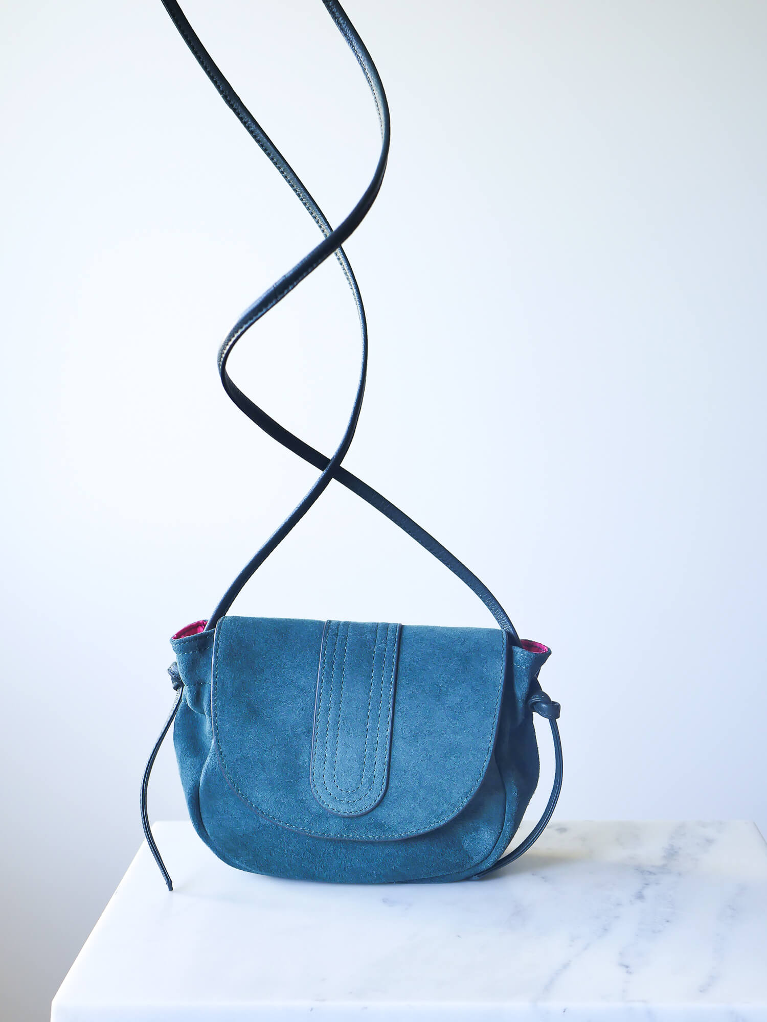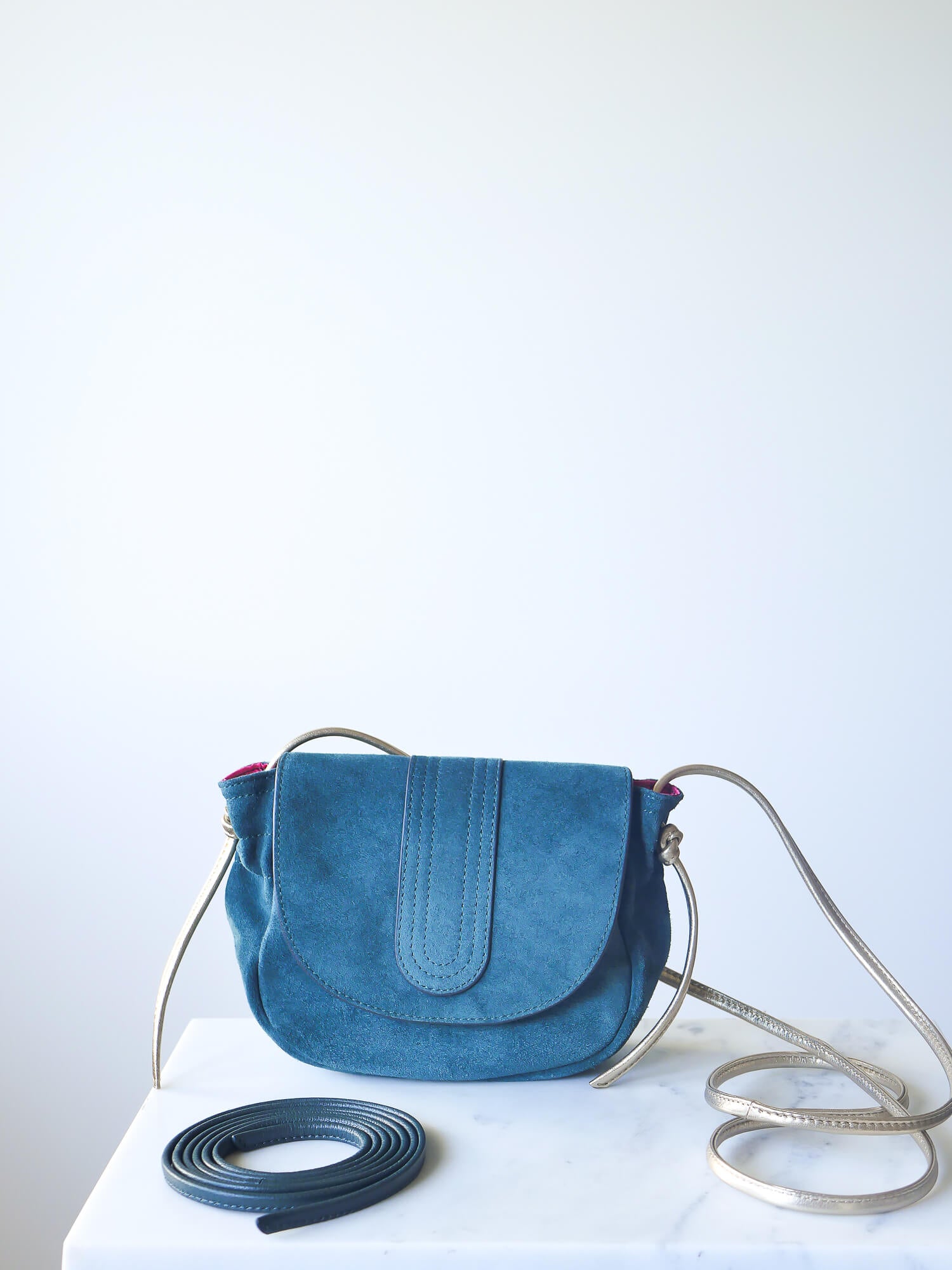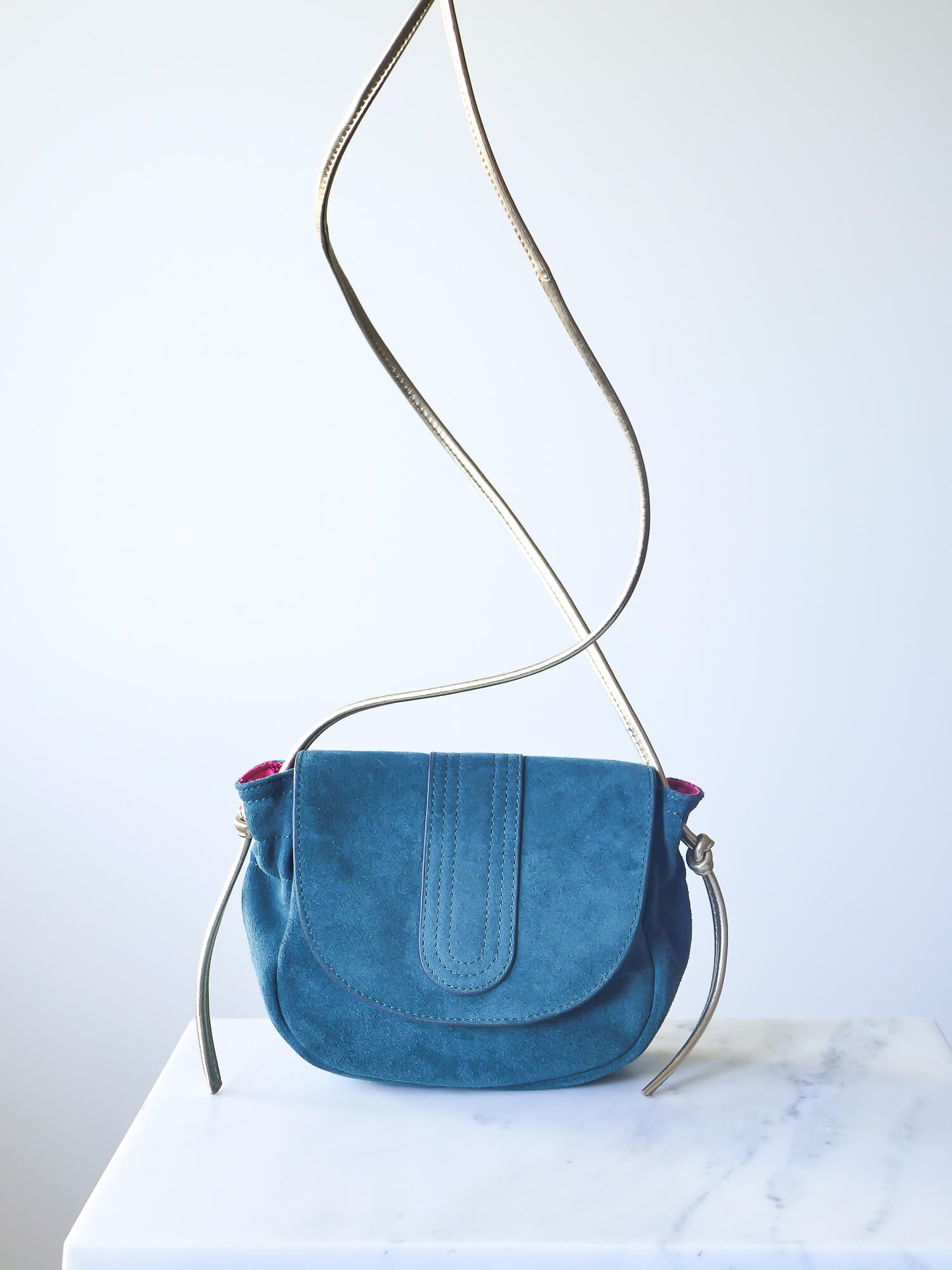 Chrissy, mini-sac à rabat en daim avec ces deux anses: une en cuir doré et une en cuir assorti à la couleur de daim. Riche et soyeux, un kaléidoscope de couleurs intenses. Inspiré des années 70, notre Chrissy réinventant le passé et réhabilitant le style classique vintage. Porté croisé ou épaule, doublé satin avec une poche intérieure, bandoulière réglable et fermer avec un top magnétique.